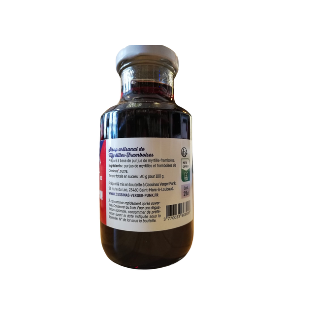 Ingrédients : pur jus de myrtilles et framboises de Cessinas, sucre.